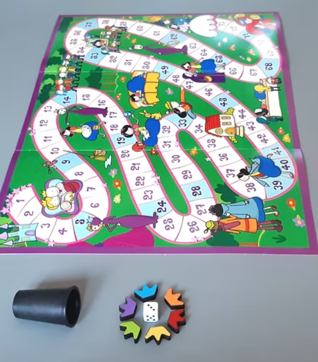 Incluye Caja y tablero de cartón super resistente. Vasito, dado y 6 coronitas de madera para avanzar en los casilleros.