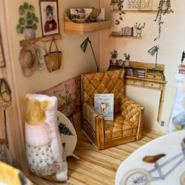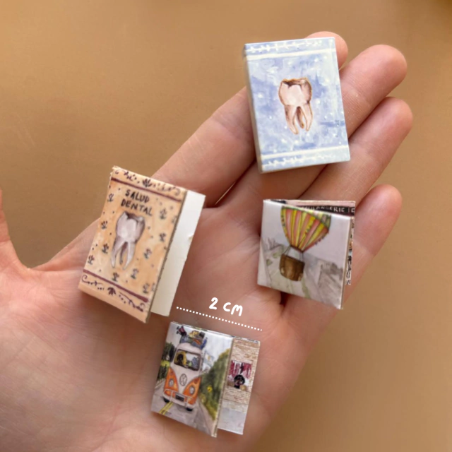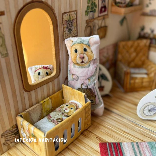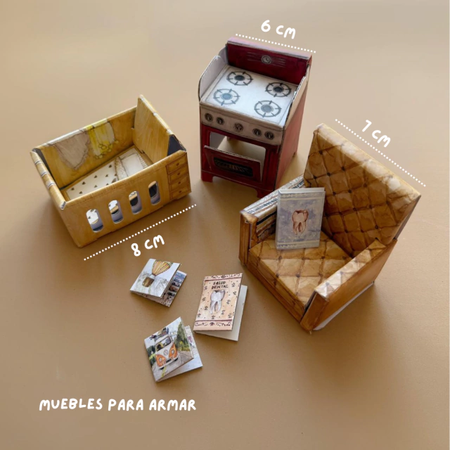 - Accesorios para jugar en cartón rígido ilustrado (mini libros, platos de comida, bici, plantas)