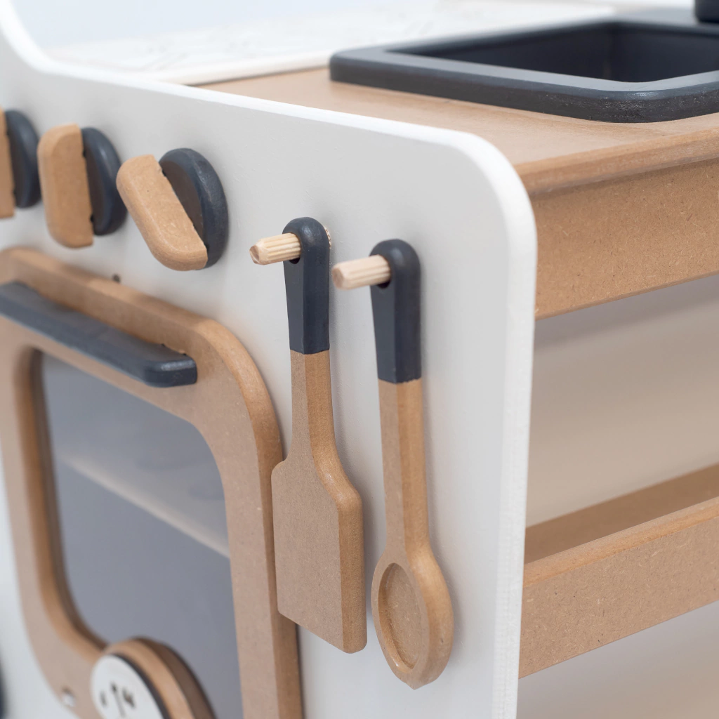 Realizada en madera MDF, pintada con esmaltes al agua. La puerta del horno posee acrílico para ver su interior.