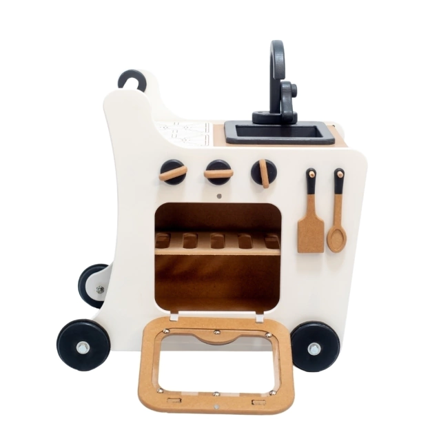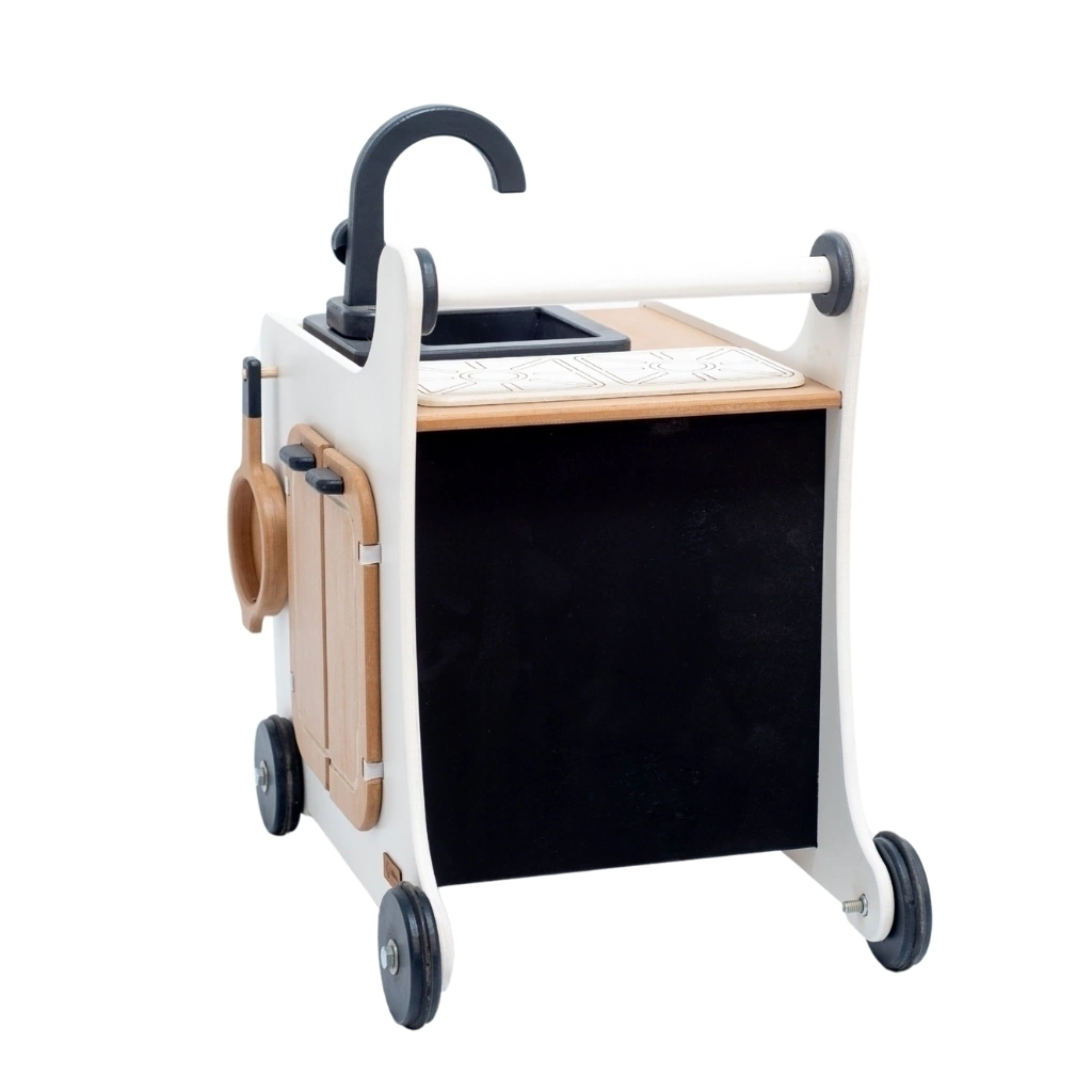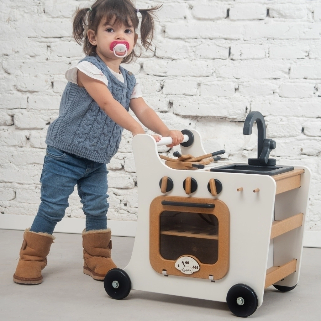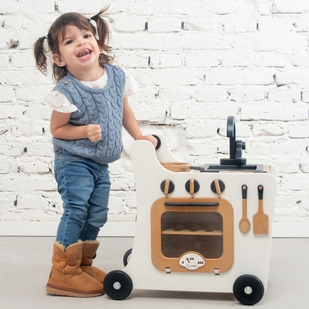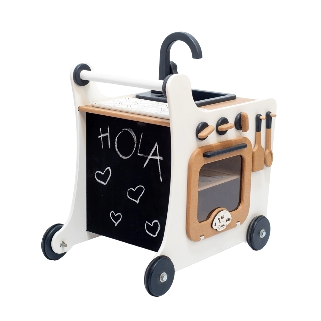 Imagina la alegría de tu pequeño al empujar su propia cocina por toda la casa, creando aventuras culinarias en cada rincón. Esta maravillosa cocina andador combina la diversión del movimiento con el encanto del juego simbólico. En el pizarrón integrado pueden dibujar sus «menús del día» o anotar los ingredientes secretos estimulando su alfabetización temprana.