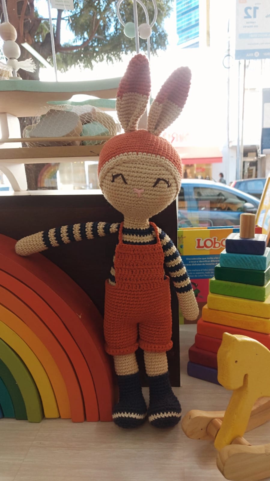 Hecho 100% con hilo de algodón, relleno de vellón siliconado, con ojitos de seguridad.