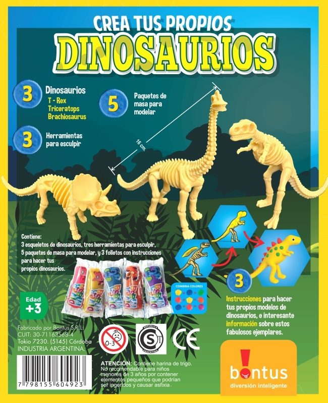 3 esqueletos de dinosaurios, 3 herramientas para esculpir, 5 paquetes de masa para modelar, y 3 folletos con instrucciones para hacer tus propios dinosaurios.