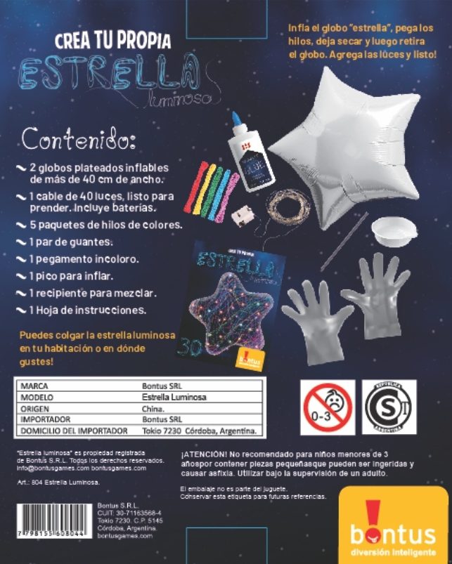 2 globos plateados inflables de más de 40 cm de ancho 1 cable de 40 luces, listo para prender. Incluye baterias 5 paquetes de hilos de colores 1 par de guantes 1 pegamento incoloro 1 pico para inflar 1 recipiente para mezclar 1 hoja de instrucciones