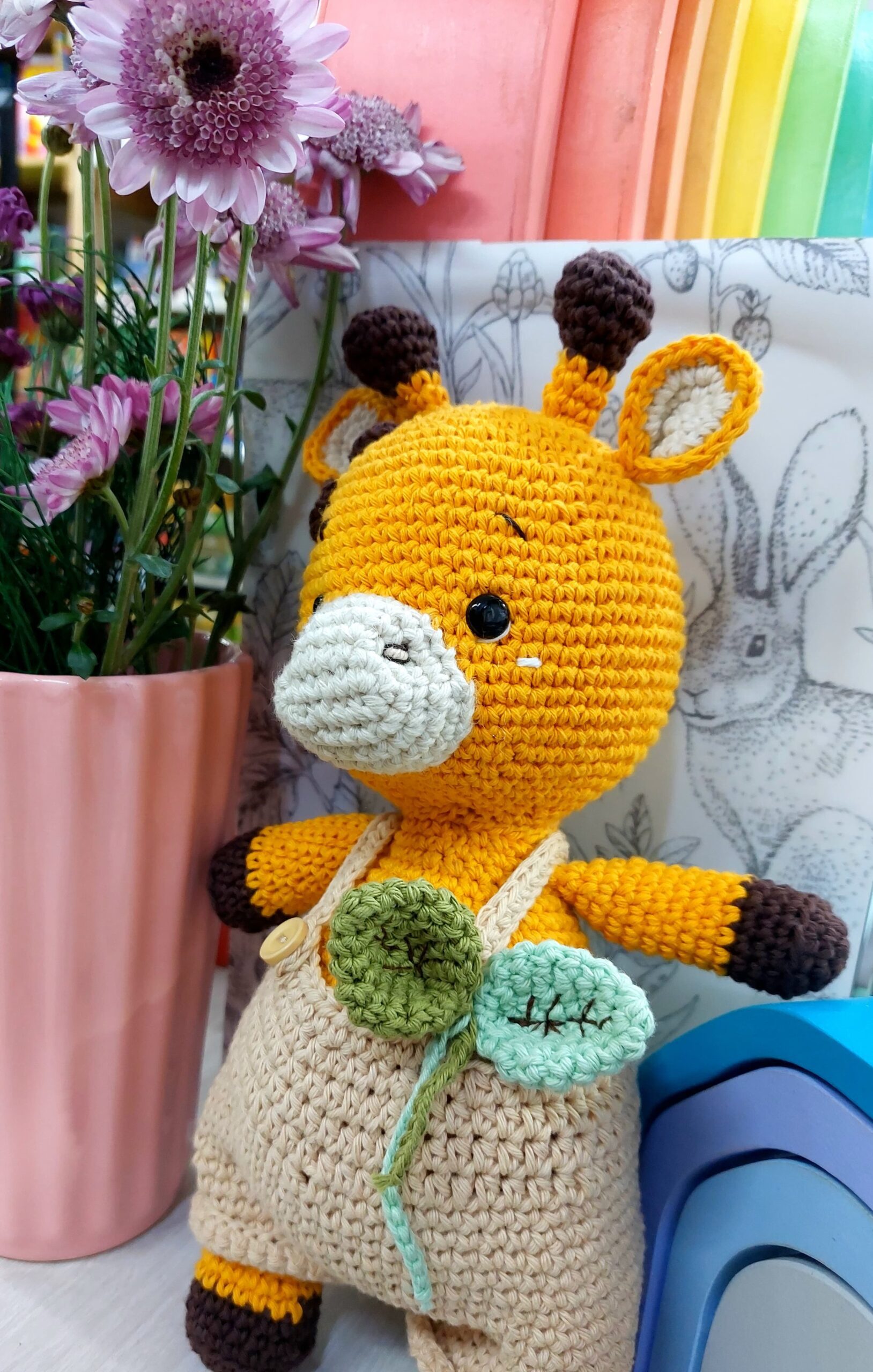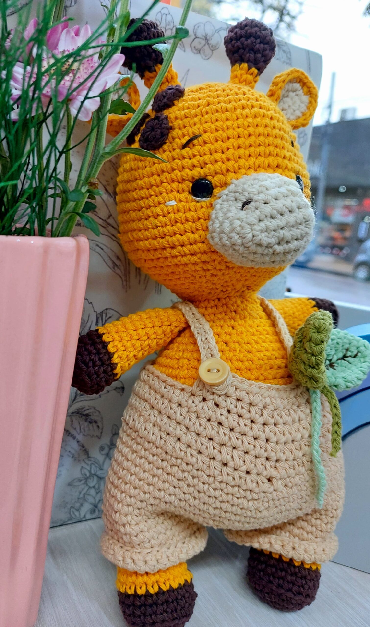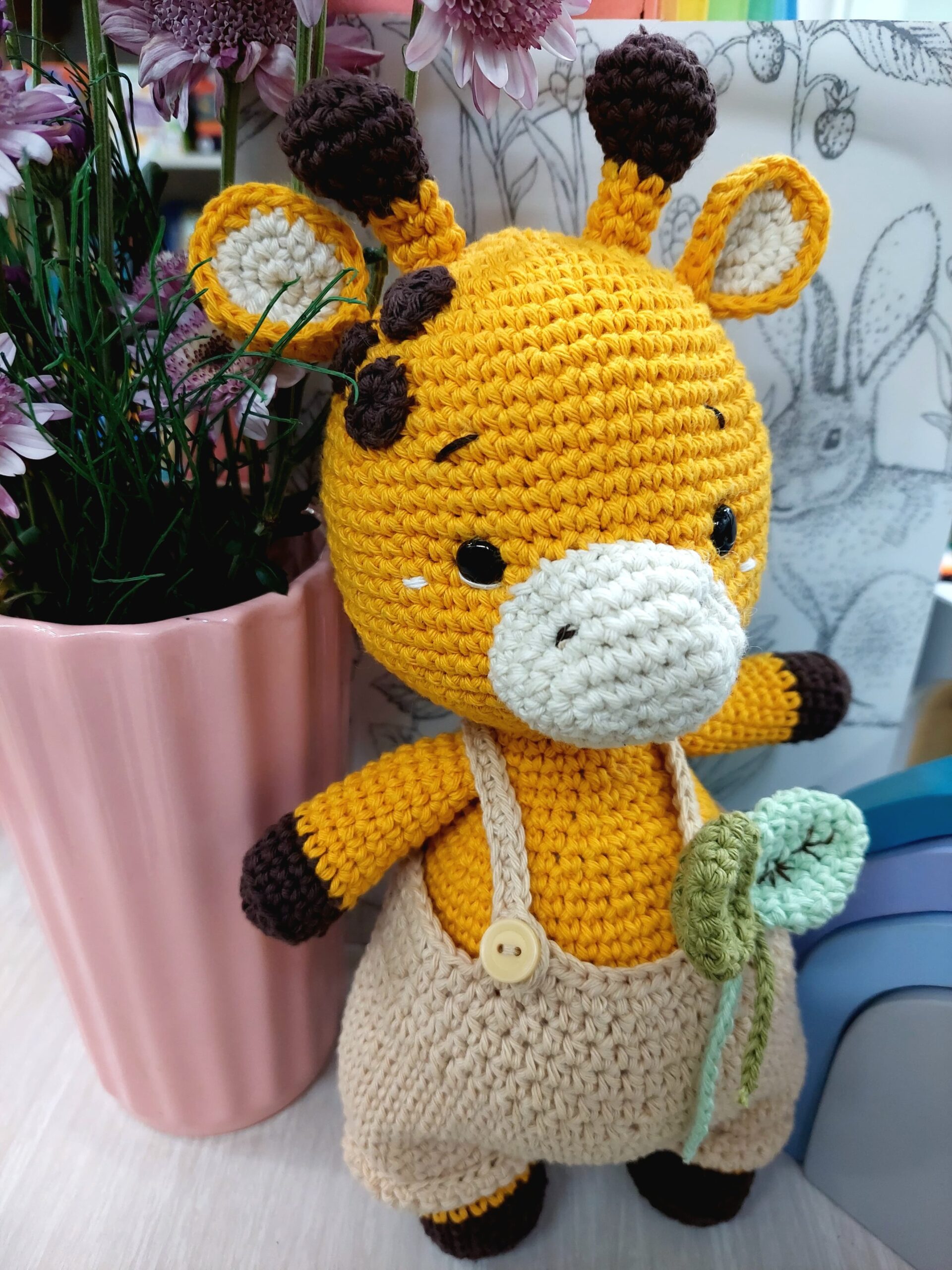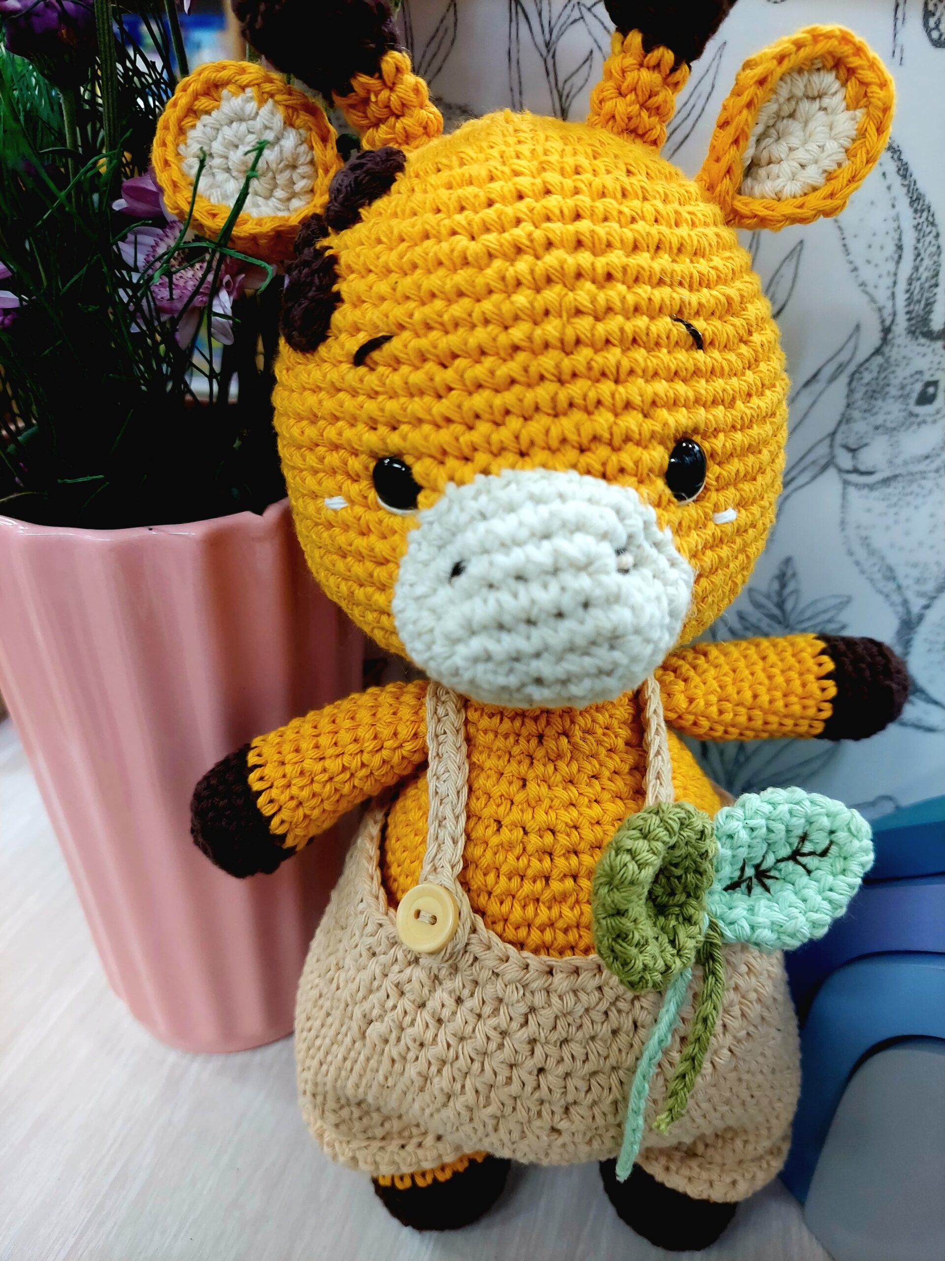 Amigurumi de jirafa, con jardinero overol y hojitas