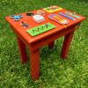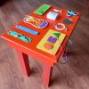 Mesa de madera con actividades para estimular el desarrollo físico-motriz , sensorial y creativo .
