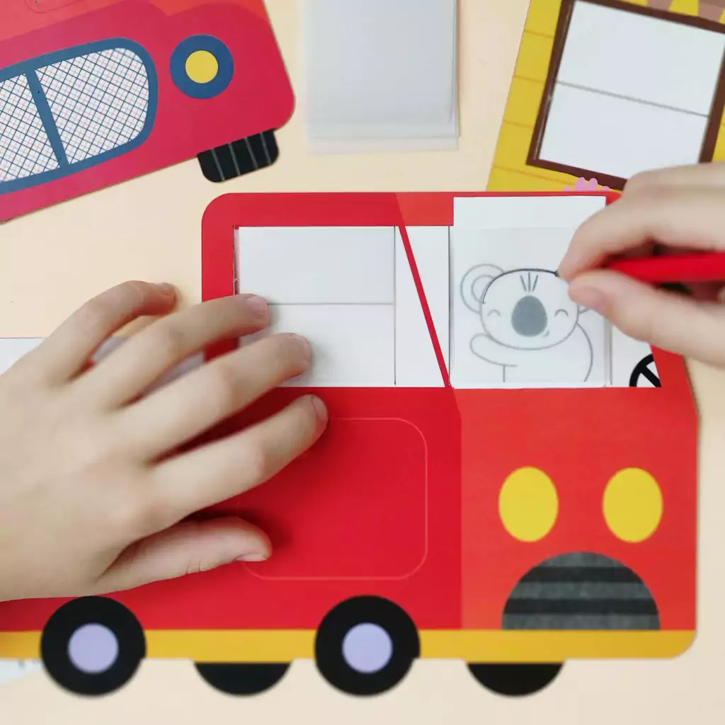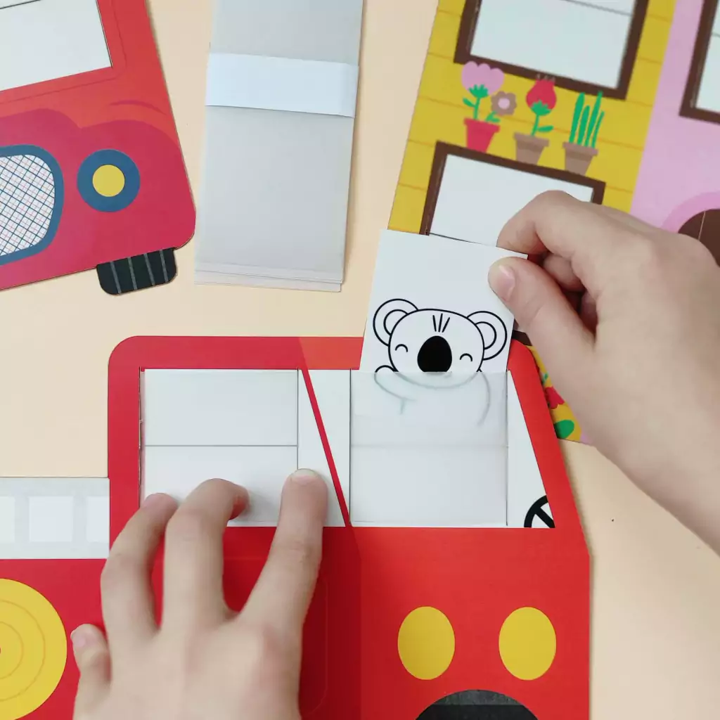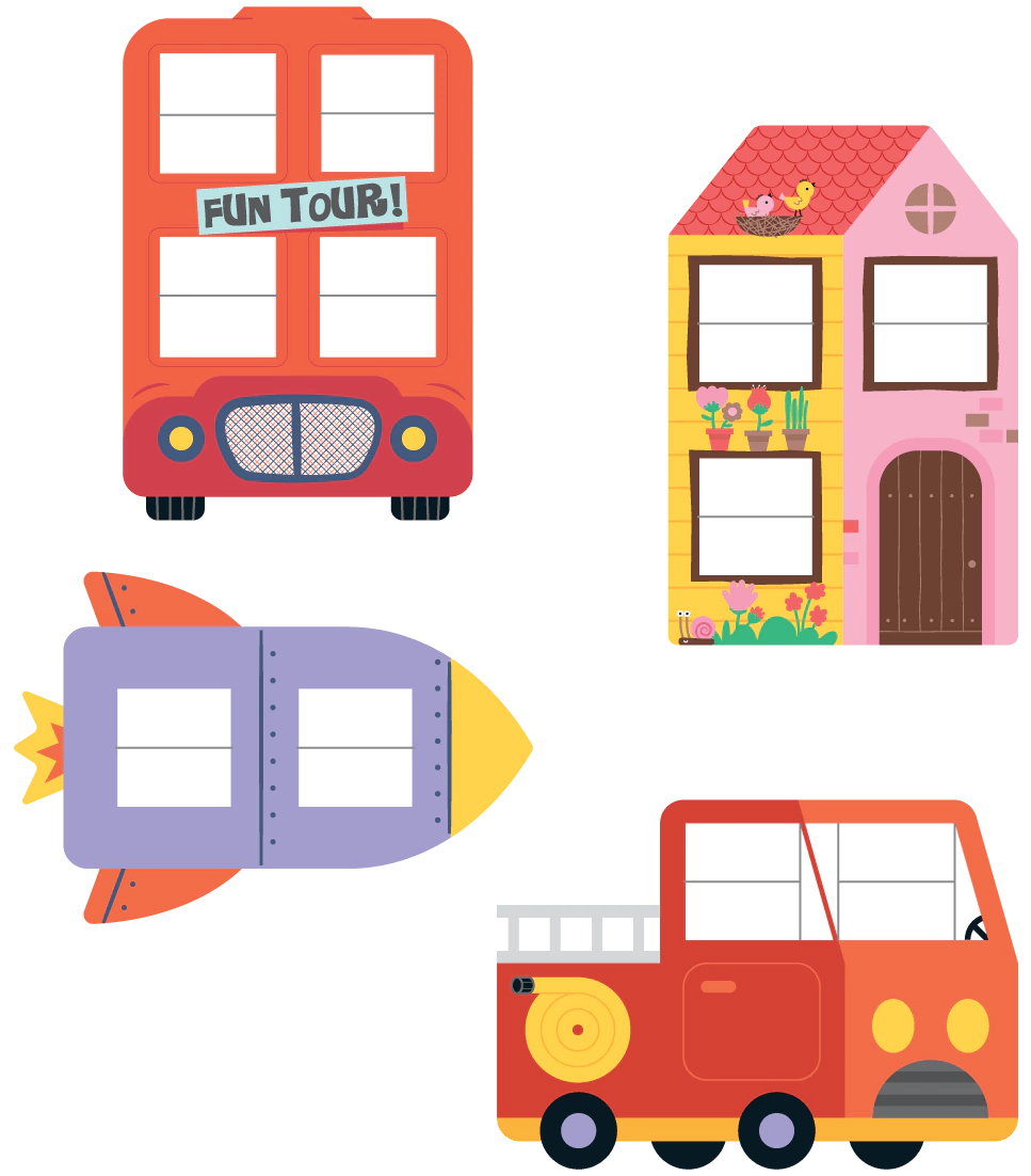Contenido: 4 tarjetas (micro, nave espacial, casita, camión de bomberos)