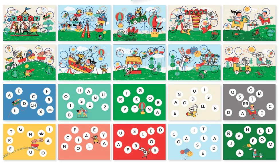 Lee la historia y descubre un mundo de palabras en el parque de atracciones; mira las letras, junta palabras y diviértete