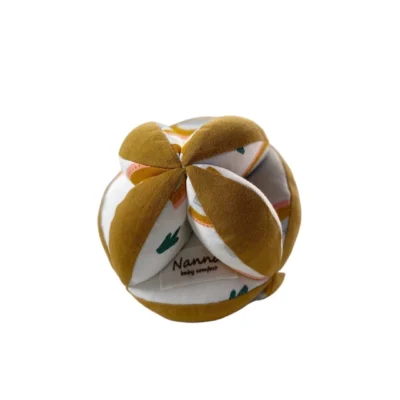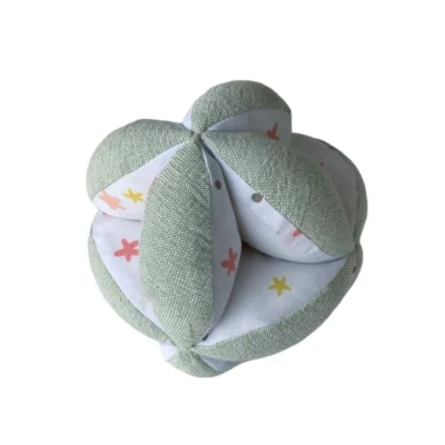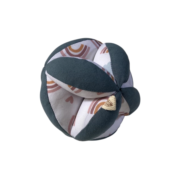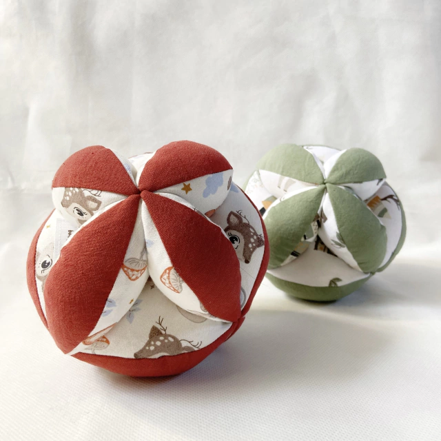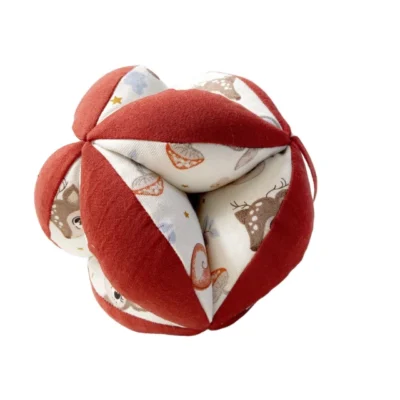 Pelota de gajos chica del método Montessori. Confeccionada en telas de algodón y rellena con vellón siliconado. Mide 15 cm de diámetro y 45 cm de contorno aproximadamente