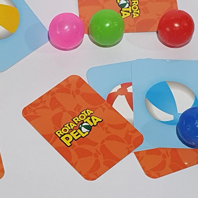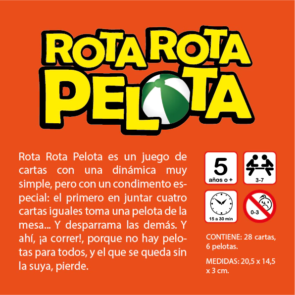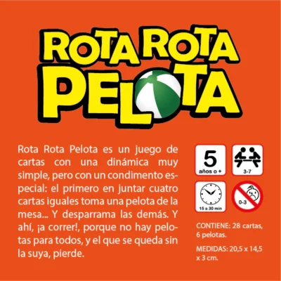 Rota Rota Pelota es un juego de cartas con una dinámica muy simple, pero con un condimento especial: el primero en juntar cuatro cartas iguales toma una pelota de la mesa… Y desparrama las demás. Y ahí, ¡a correr!, porque no hay pelotas para todos, y el que se queda sin la suya, pierde.