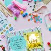 Álbum para decorar desde las tapas hasta su interior, papeles de distintos colores y texturas, cartones micro corrugados, cintas de colores, lentejuelas de distintos colores y tamaños, adhesivo vinílico, hilos de algodón, pompones, stickers, apliques en tela y mucho más.