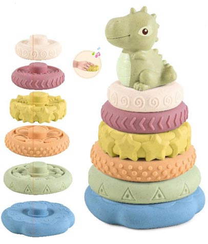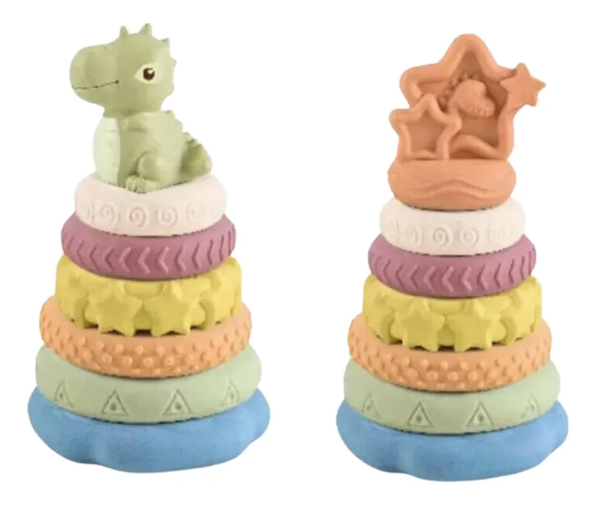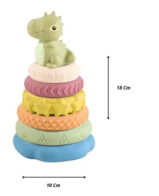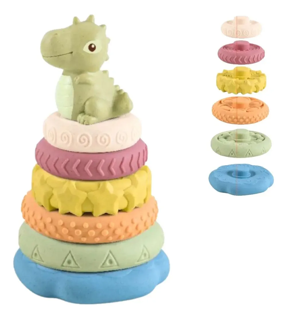 - Consta de varios anillos de diferentes colores, tamaños y texturas, y una pieza superior en forma de dinosaurio.