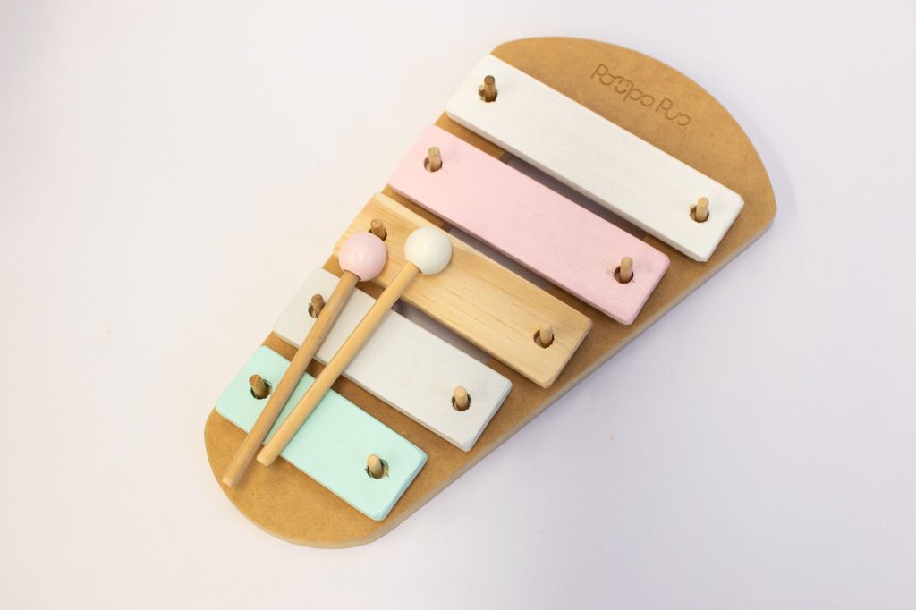 Contiene 5 teclas que se encastran y producen diferentes sonidos y 2 baquetas.